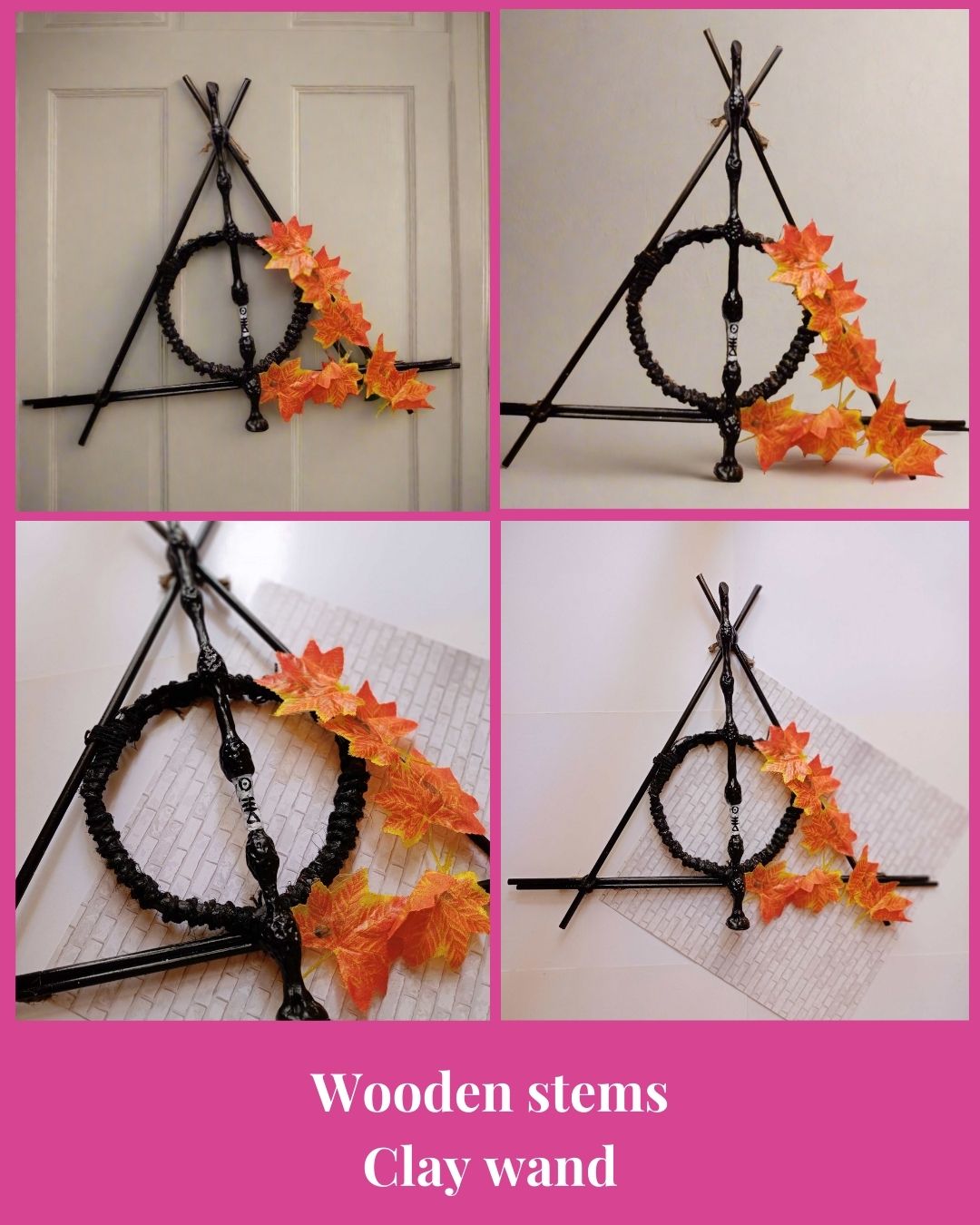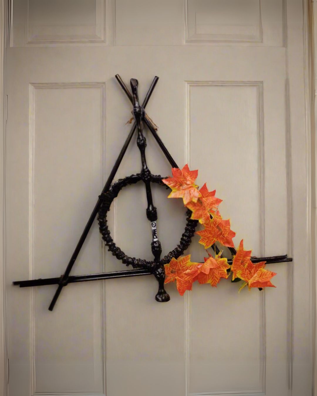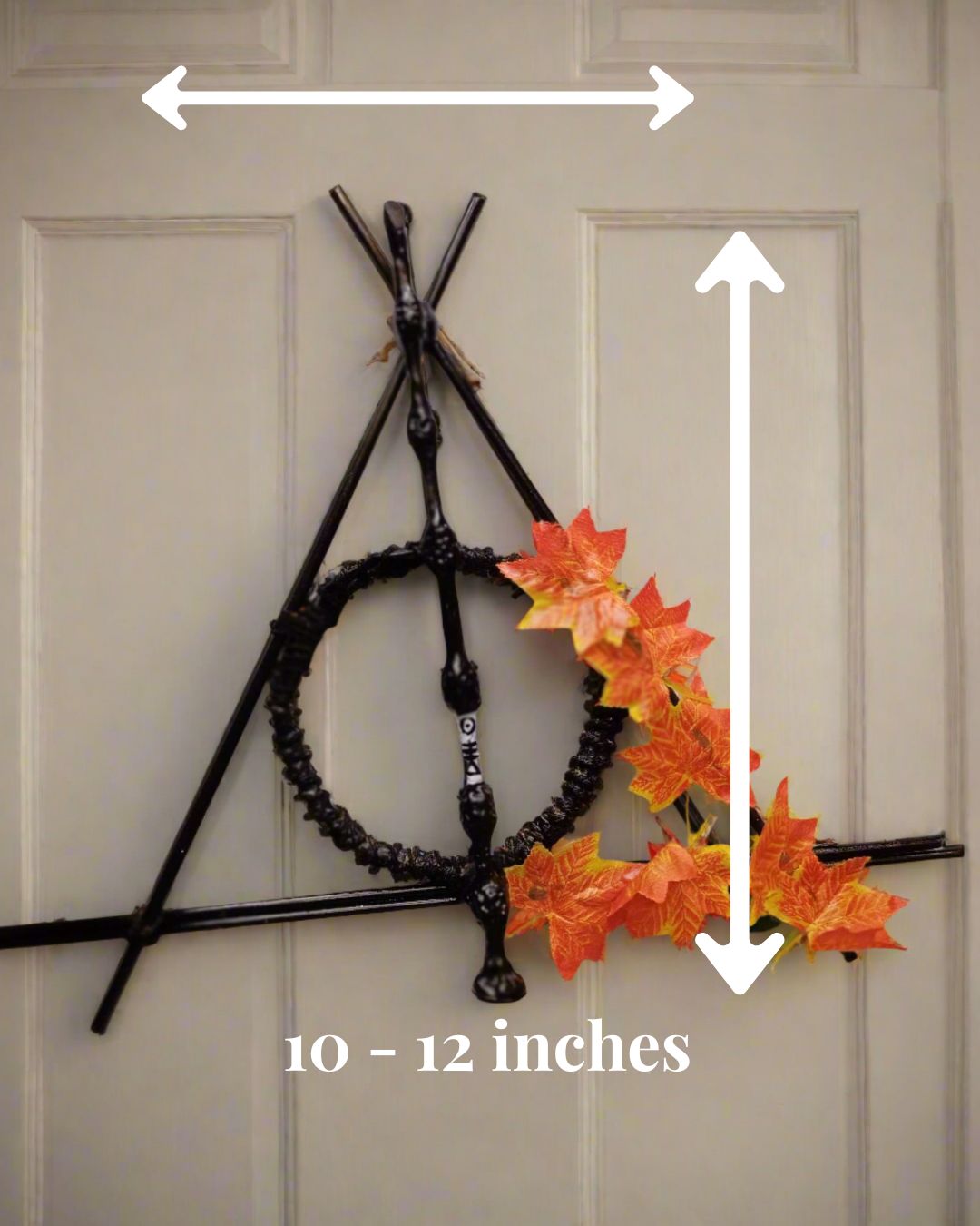 Unlock the mysteries of The Deathly Hallows with our enchanting bedroom door decor! Featuring the Invisibility Cloak, Resurrection Stone, and Elder Wand, this aesthetic piece is perfect for any Harry Potter enthusiast.