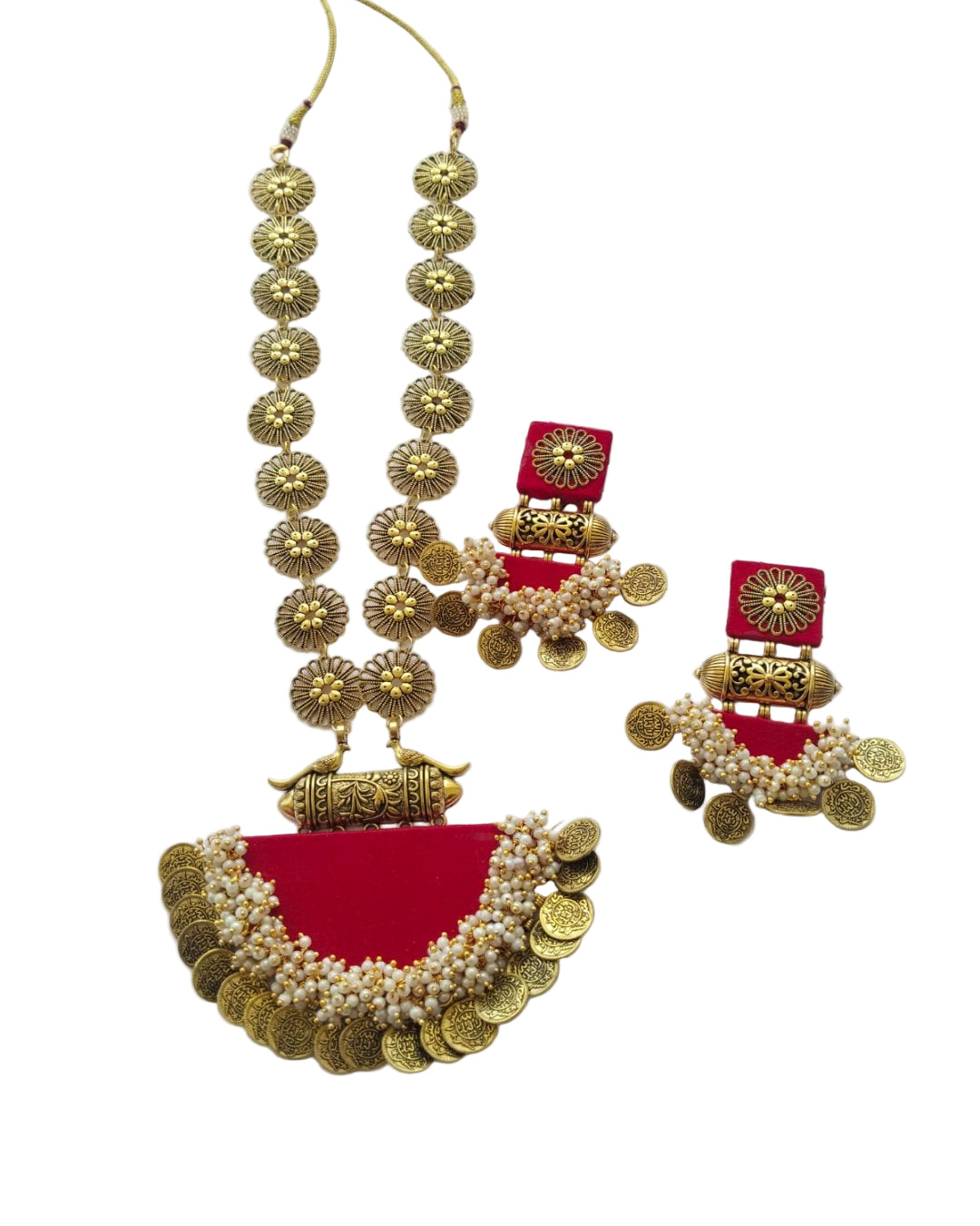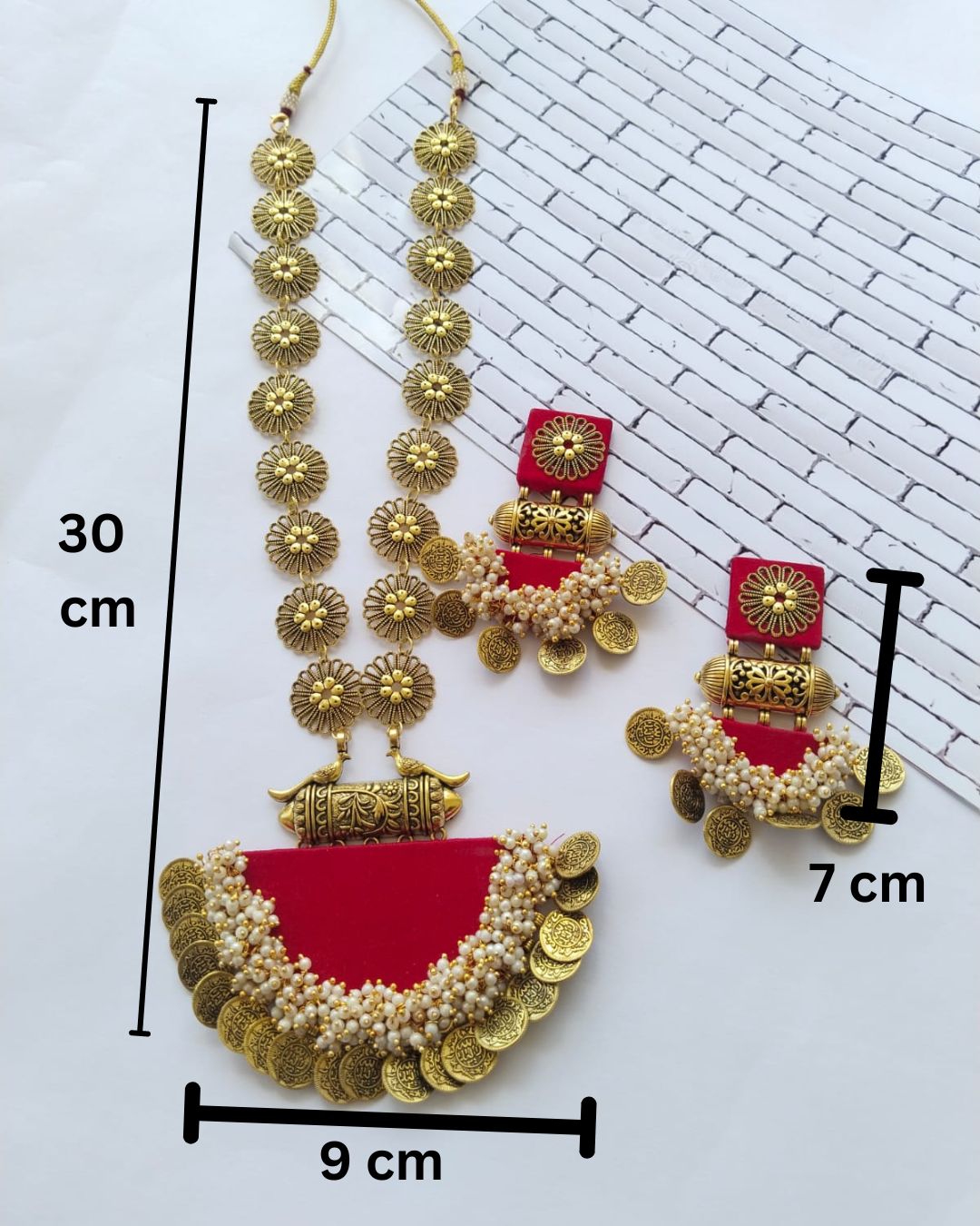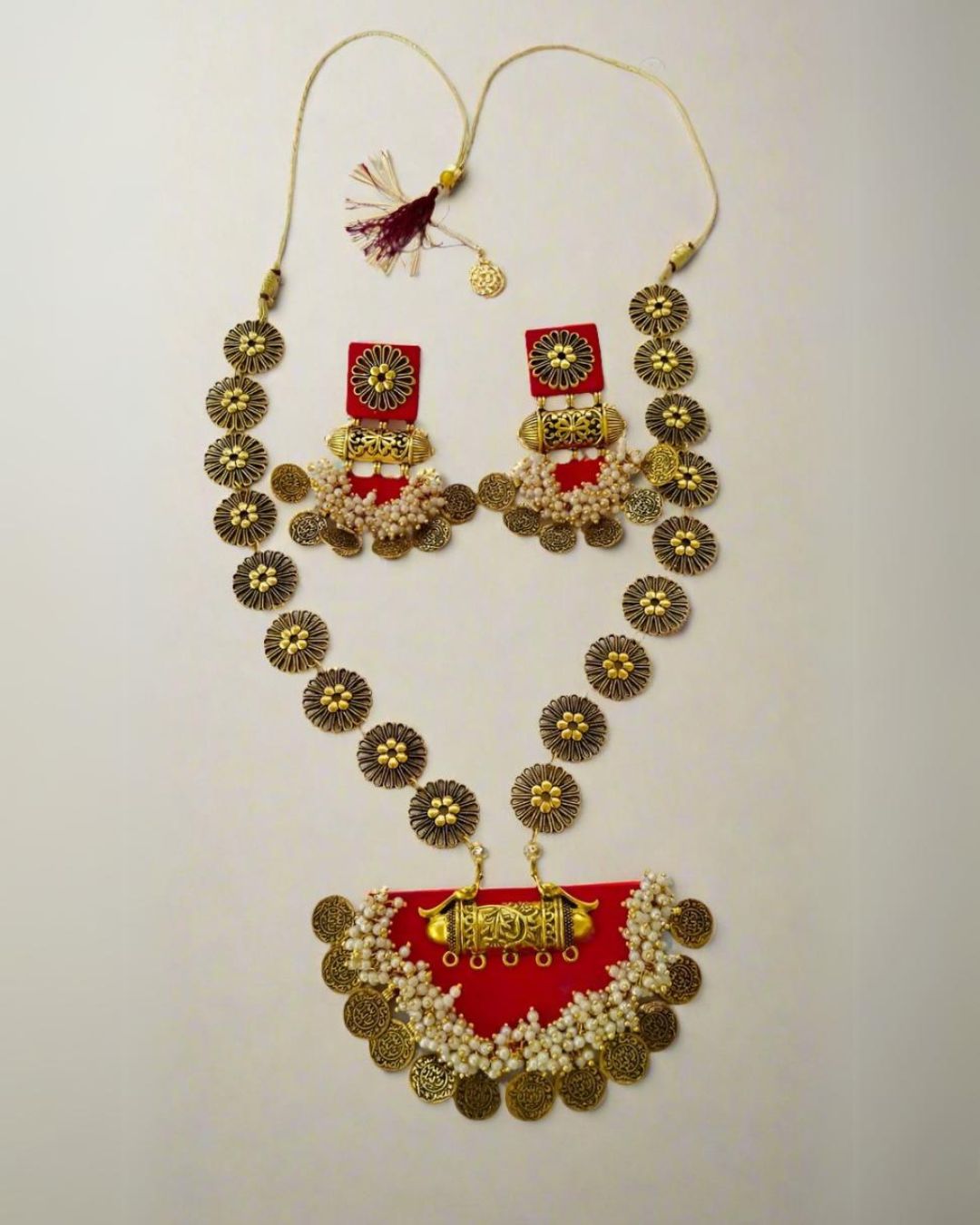 बालियों के सेट के साथ गर्म लाल सुनहरे मनकों वाला लंबा हार