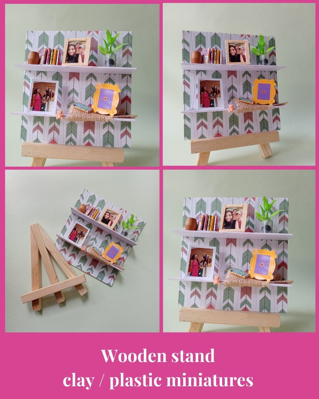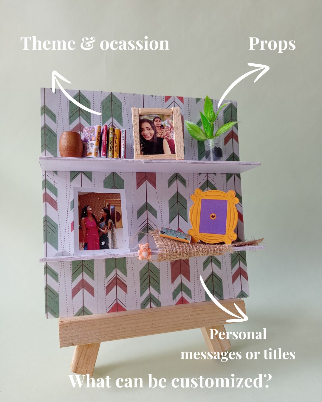 A Wooden Stand for Frame offers customization options for theme, photos, mini props, and background color, allowing a personalized touch.
