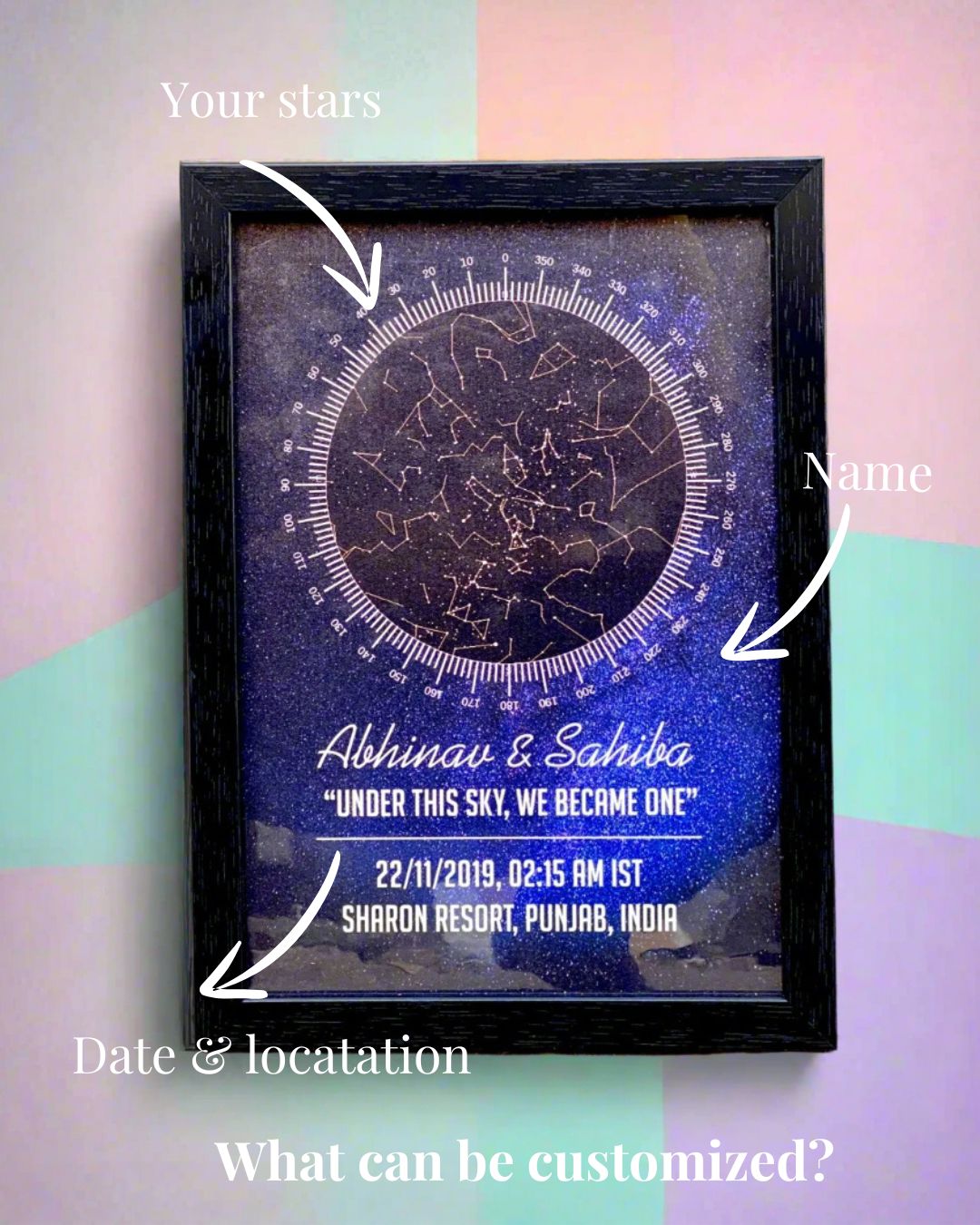 The constellation map, name, date, and description can all be customized to fit your needs.