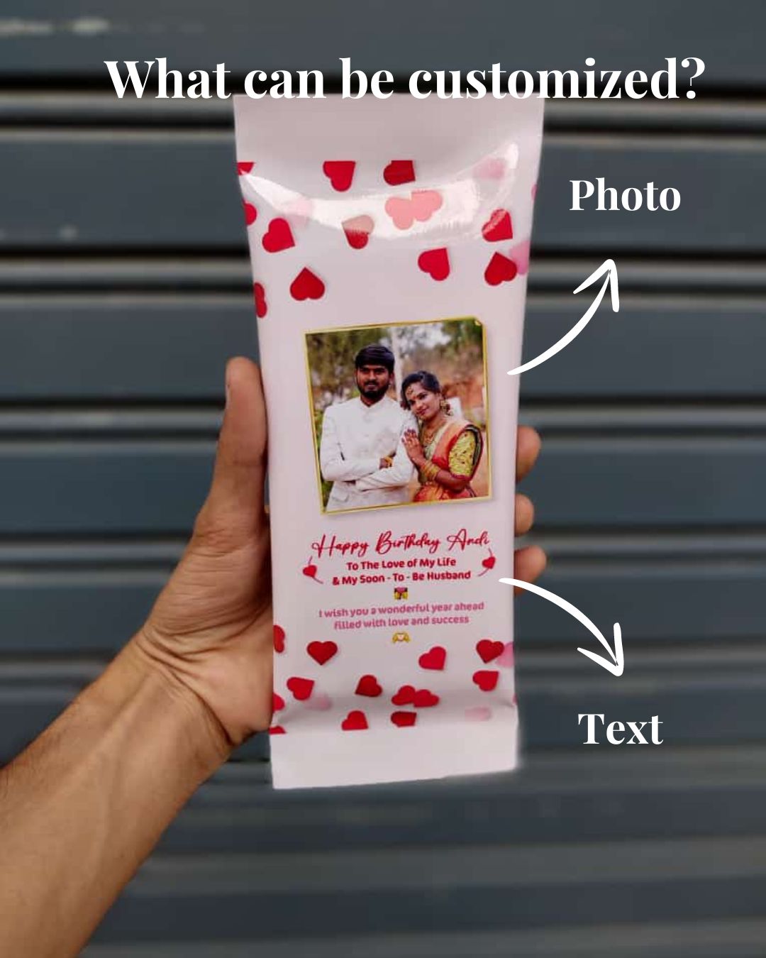 Send special sweet surprises with these personalized chocolates! Our customizable message-wrapped chocolates come with a playful wrapper perfect for saying “I love you” in the tastiest way. Ideal for birthdays, anniversaries, or just because! Yum!