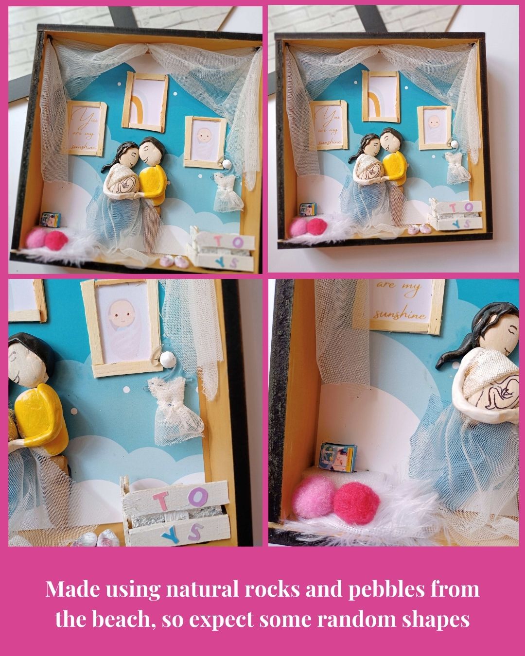 एक जोड़े के जीवन में सुंदर यात्रा, एक नए का स्वागत और एक साथ तीन नए जीवन की शुरुआत को व्यक्त करने के लिए बनाई गई एक कंकड़ कला।