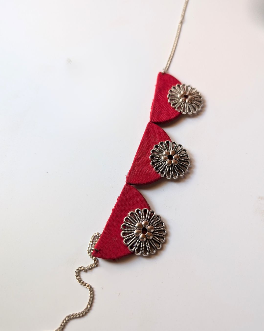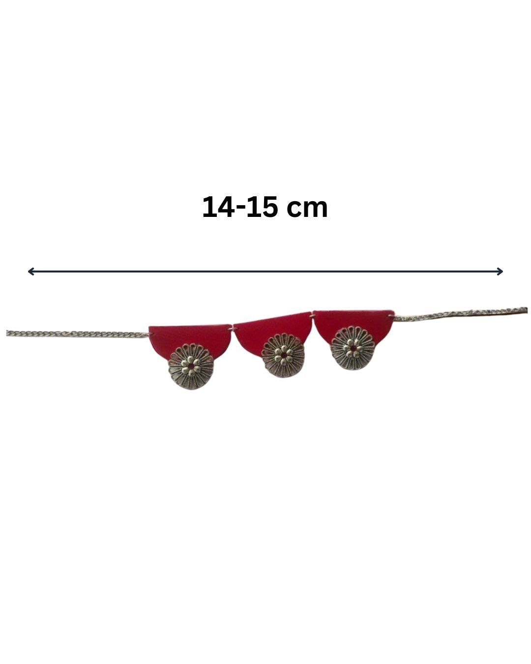 यह स्टेटमेंट पीस किसी भी लुक को पूरा करने का सही तरीका है। चमचमाती चांदी की चेन और जीवंत लाल कपड़े से तैयार किया गया, यह चमकदार चोकर एक बोल्ड, आकर्षक रंग जोड़ता है।