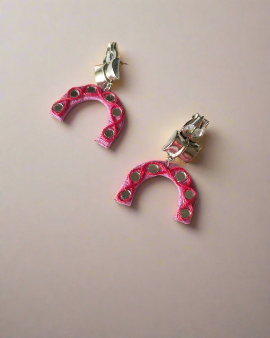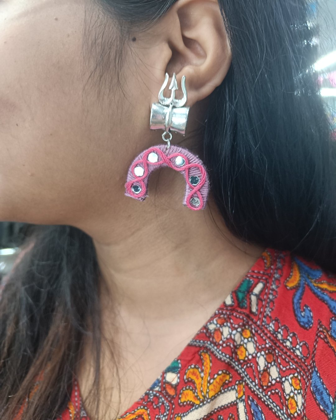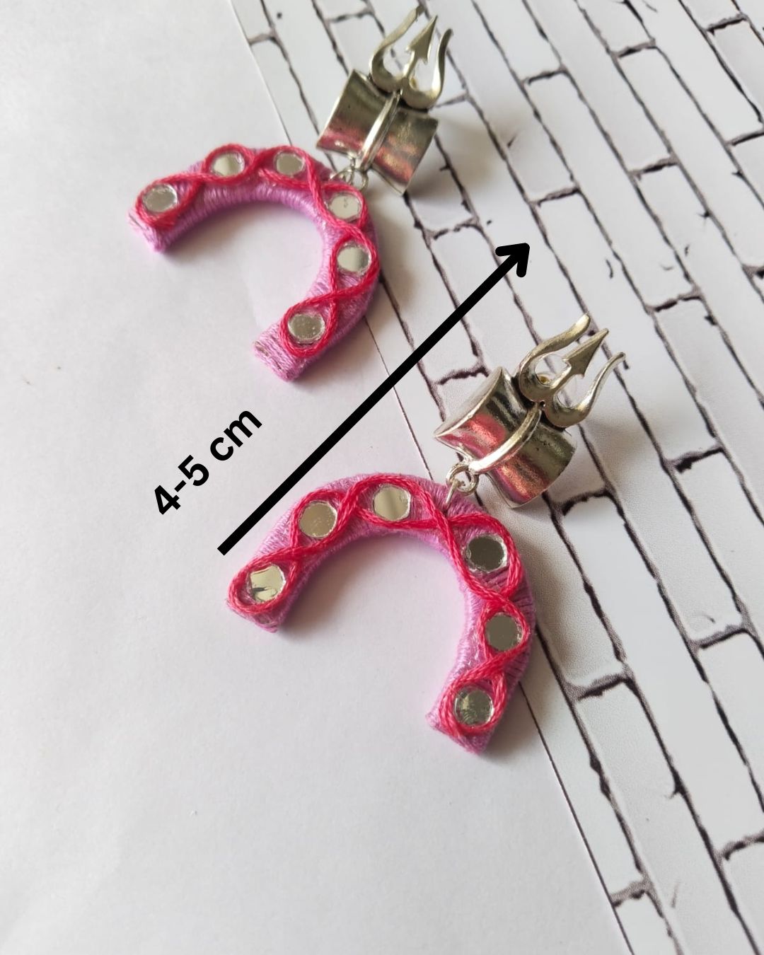 त्रिशूल डमरू गुलाबी धागे की बालियां
