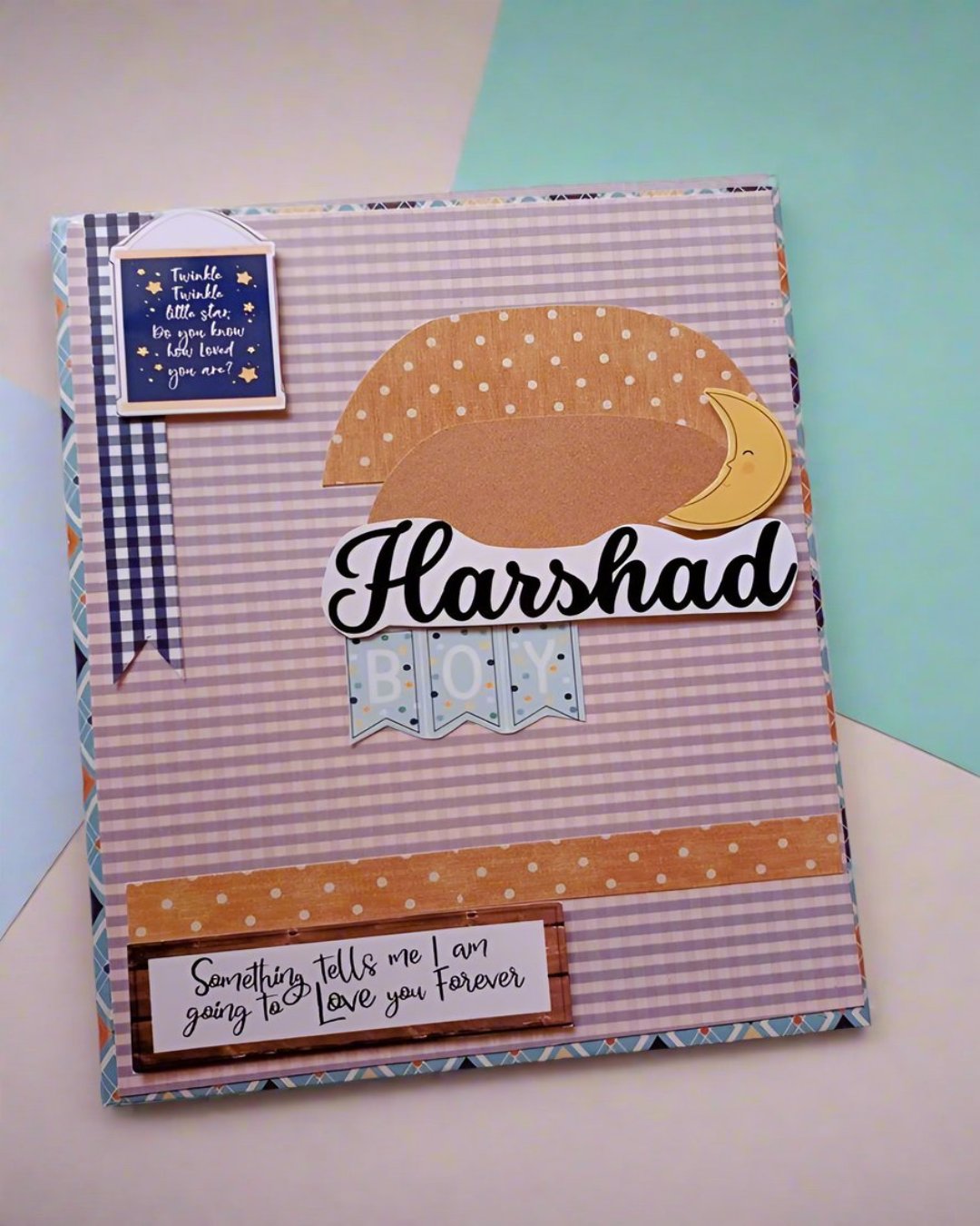 Create a Personalized Baby Boy Scrapbook with 25-30 photos, 12-14 customizable layouts, featuring adorable baby pictures, milestones, cute quotes, special memories, and personalized messages, all designed with soft colors, playful patterns, and elements that celebrate the joy of welcoming a baby boy.
