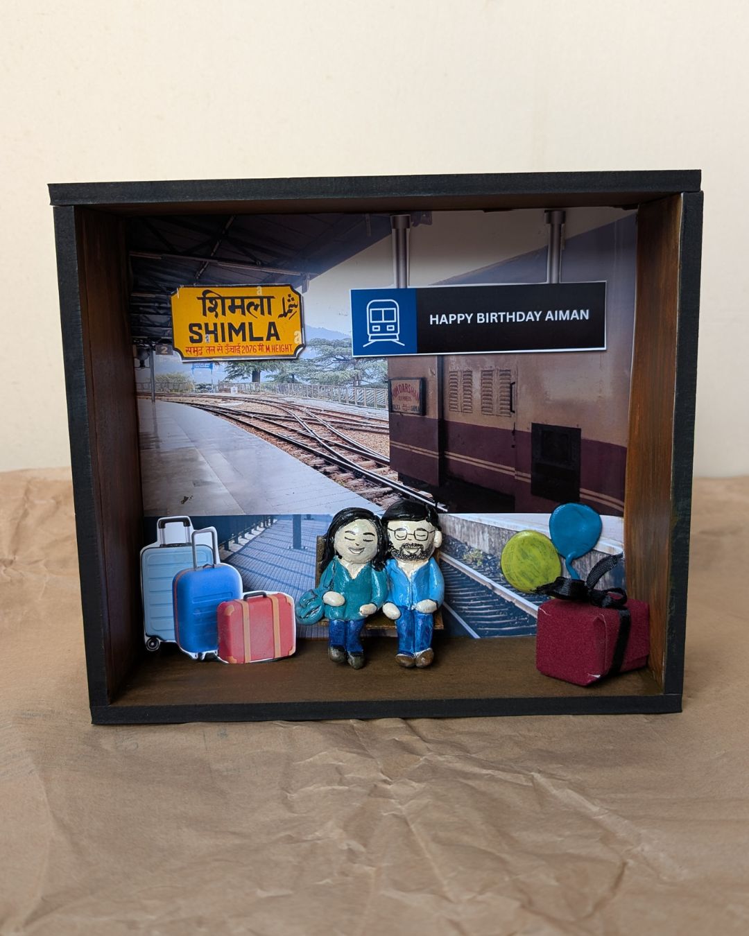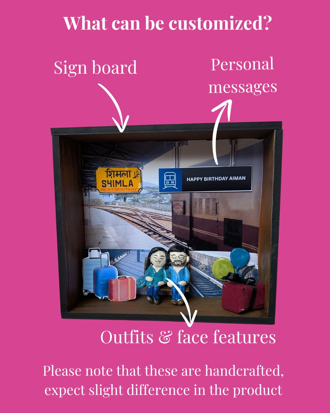 Custom train station shadow box with personalized theme, occasion, props, and texts, ideal for celebrating special moments or as unique decor.