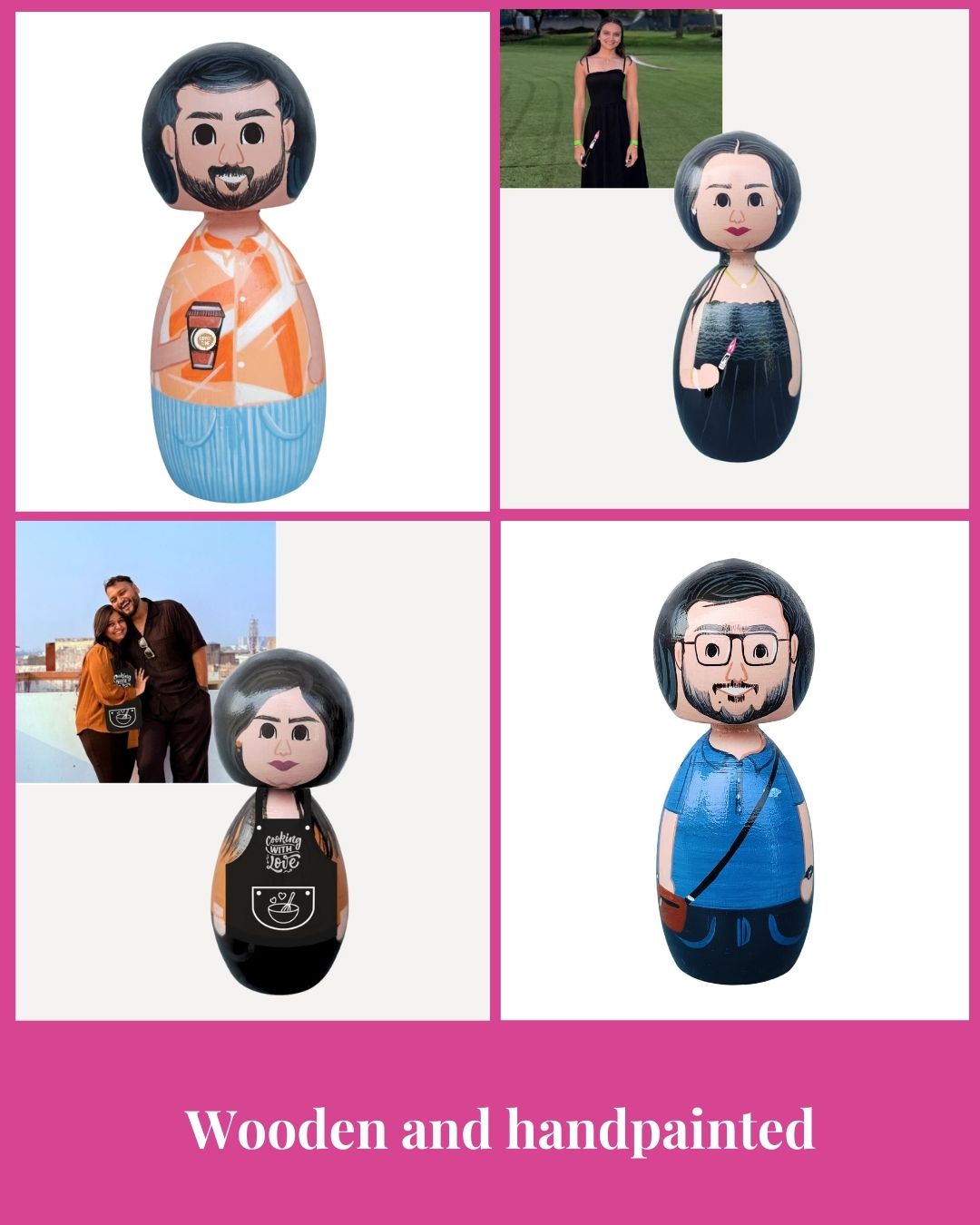 A Customized Wooden Peggy Doll is a handcrafted figurine representing an individual with personalized details, including outfit, hairstyle, and facial features. It’s a unique and thoughtful keepsake or gift.