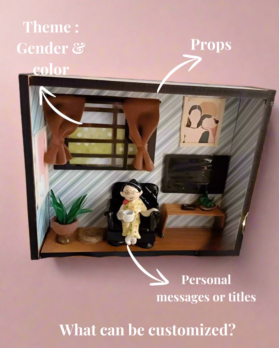 A Grandmother's Keepsake Mini Shadow Box, customizable with theme, gender, color, props, and personalized texts or messages to celebrate her special moments and memories.