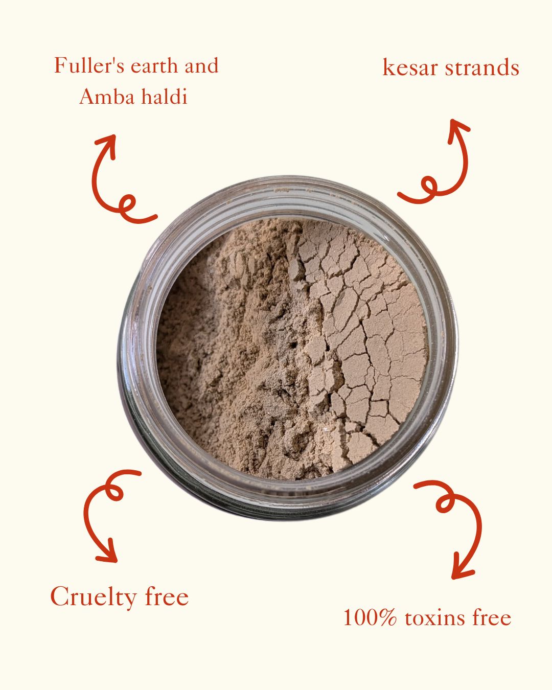 Kesar, sandalwood powder, fuller's earth, amba haldi, kesar strands and oatmeal powder