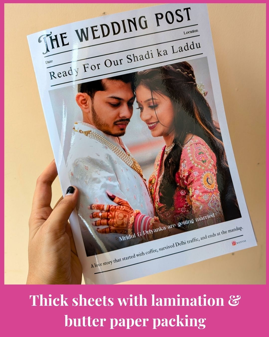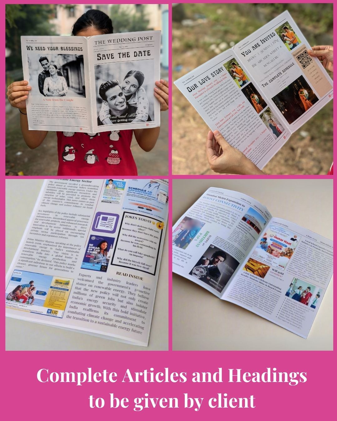Personalized Wedding Invite Newspaper with customizable stories, headings, pictures, and dates, creating a unique and memorable way to invite guests.