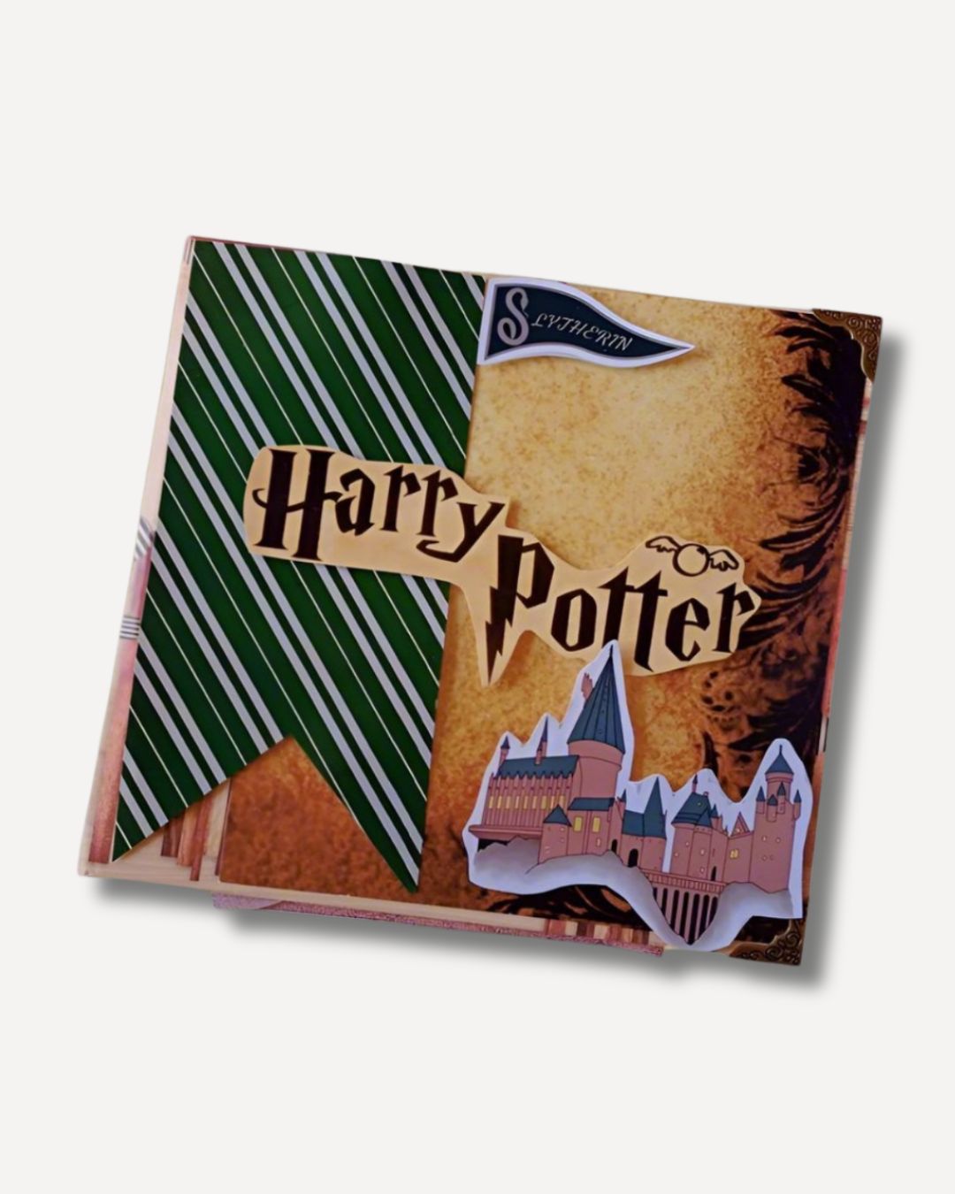 Create a Slytherin Hogwarts Scrapbook with 25-30 photos, 12-14 customizable layouts, featuring iconic movie stills, quotes from Slytherin characters, personalized memories, and moments that reflect the cunning, ambition, and pride of Slytherin House, all in a magical and stylish design.